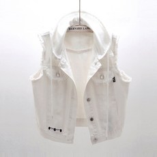 Asure 여자 무지 데님 베스트 후드 스트링 화이트 청조끼 청자켓