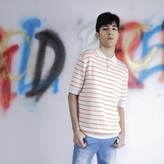 골드퍼센트 남성용 스트라이프 스몰로고 반팔 카라 니트