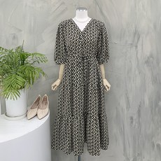 행복여[신상무배]하프 럽 허리 끈 조절 벌룬 소매 플레어 원피스