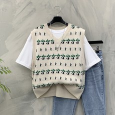 행복여 푸릇 새싹 패턴 니트 조끼
