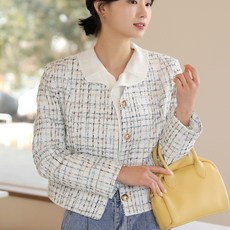 빼빼 여성용 노카라 골드 4버튼 트위드 체크 자켓