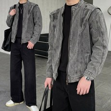 바이커 워싱 더블 커브드 절개 크롭핏 데님 자켓