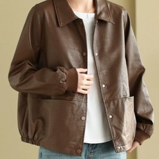 AOKADA 여성 중년 칼라넥 버튼 숏 레더 자켓 오버핏 주머니 상의