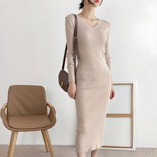 뜨개진 여성용 쫀쫀 뒷트임 브이 골지 쉐일리 롱 원피스