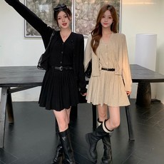 Yumico 여성 하객룩 니트 투피스 플리츠 치마세트 빅사이즈 고급 겨울 가디건 니트 플레어 원피스 체형커버 투피스 면접룩 오피스룩 플리츠원피스