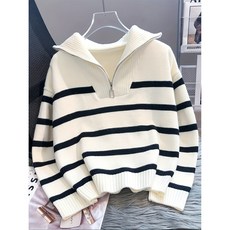 우아한 여성 복고 감각의 편안하고 캐주얼하며 어디에나 잘 어울리는 가을 겨울 필수 반지퍼 흑백 스트라이프 풀오버 여성 스웨터