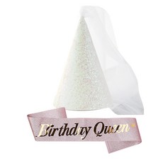 조이파티 글리터 베일 파티고깔모자 + 생일어깨띠 Birthday Queen 세트, 펄화이트(모자), 로즈골드(어깨띠), 1세트