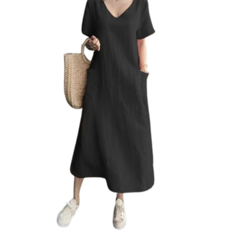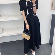 페이퍼먼츠 배색 디자인 더블 포켓 반팔 플레어 롱 원피스 01906