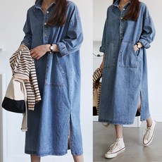 하늘바라기 여성용 빅 반오픈 데님 롱 원피스