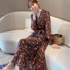 플랜데이 리드 베이직 허리 스트링 플리츠 긴팔 롱 원피스