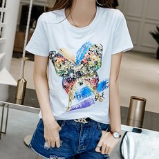 데일로엔 여성용 나비 스팽글 기본핏 반팔 티셔츠